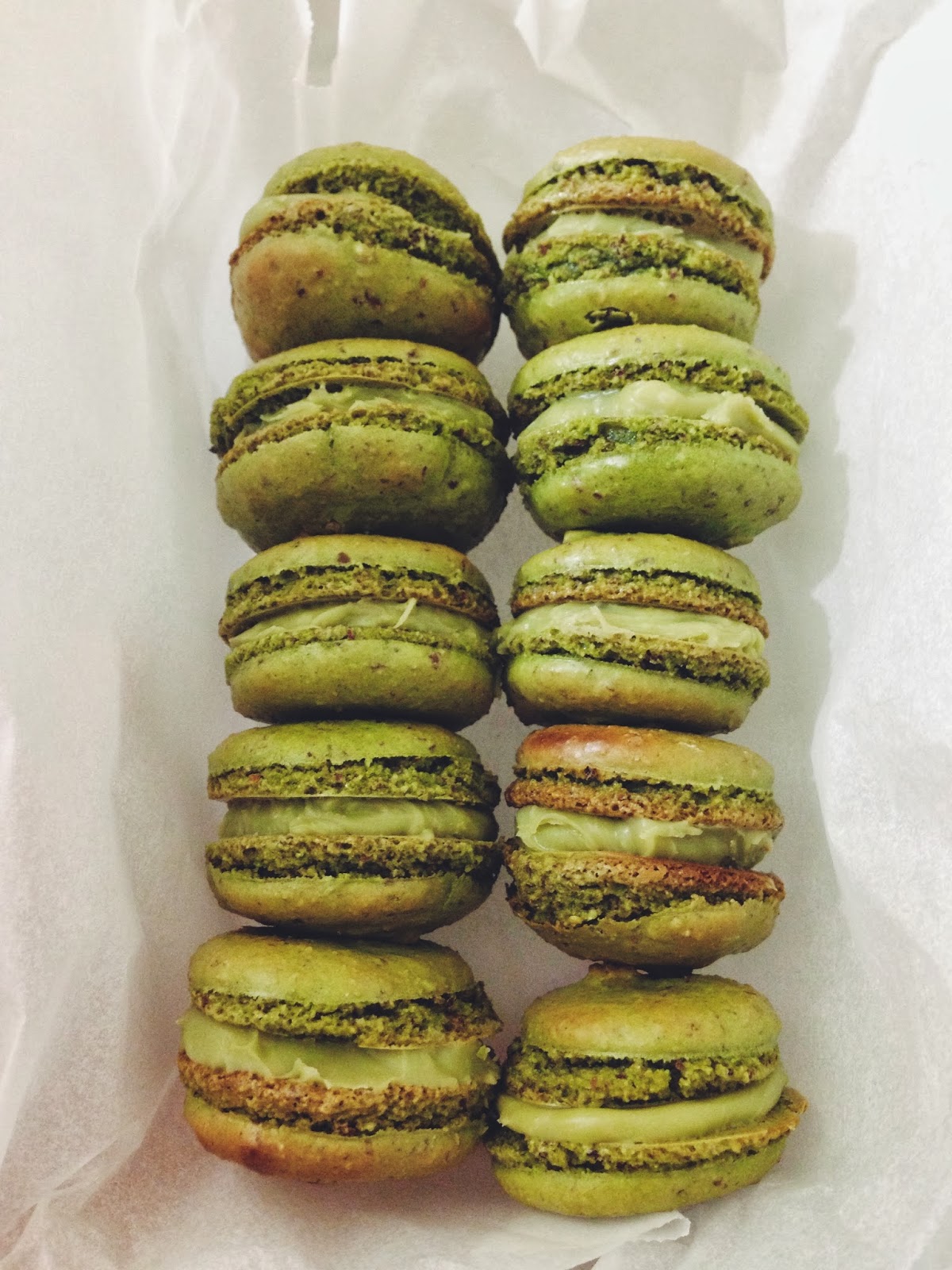 | My 6th batch in October 2013 with friends - Green Tea Macarons |
